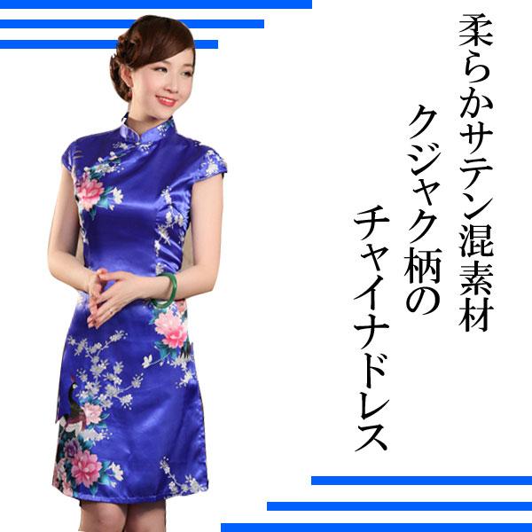 上品なサテン混生地、クジャク柄ひざ丈のチャイナドレス。