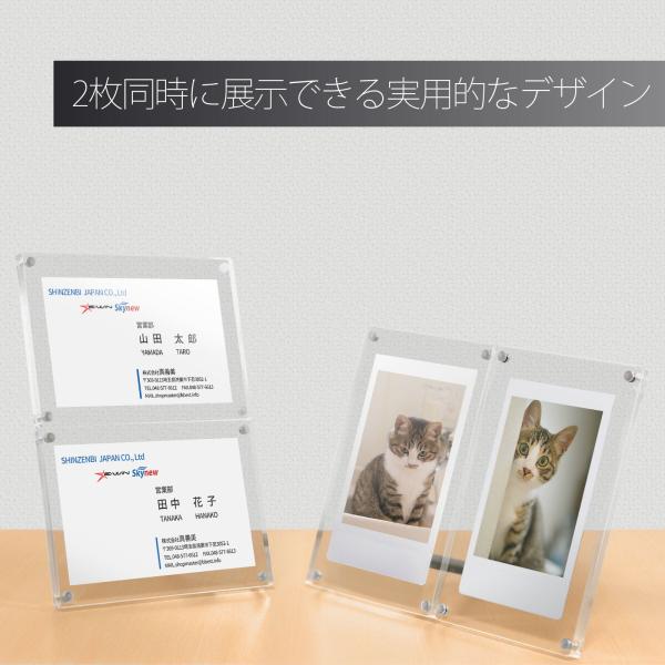 名刺やチェキ、トレーディングカードなどを2枚同時に並べて展示できるアクリルフォトフレームです。