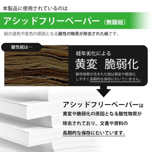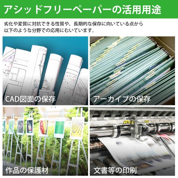 黄変や脆弱化の原因となる酸性物質が除去されており、文書や資料の長期保存に向いています。 CAD図面や重要なアーカイブの保存にもご使用いただけます。