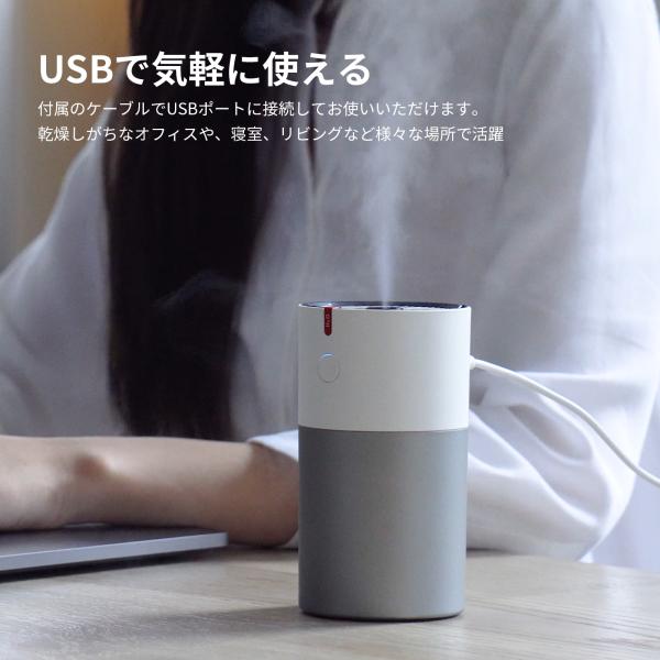 【USBで気軽に使える】付属のUSBケーブルでパソコンなどと接続してお使いいただけます。乾燥しがちなオフィスや、寝室、リビングなどさまざまな場所で活躍。※コードレスではお使いになれませんのでご注意ください。