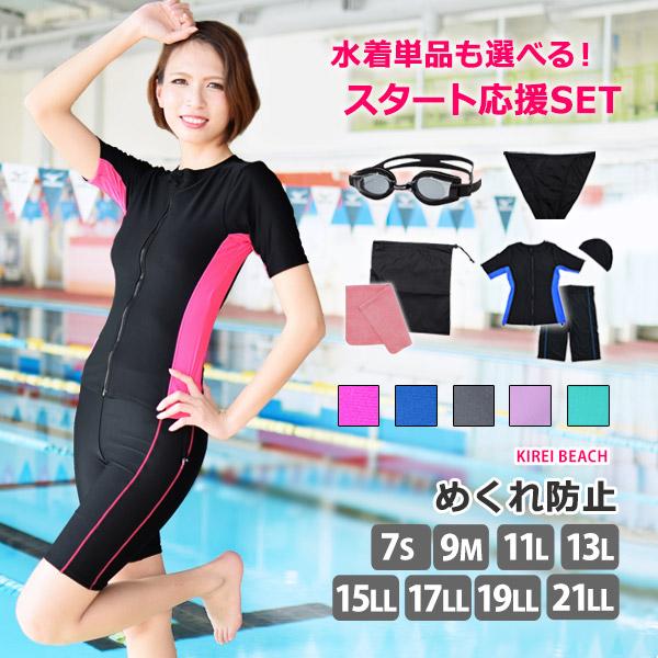 送料無料 選べる フィットネス水着 レディース 半袖 スイムキャップ ゴーグル ショーツ タオル セット セパレート 大きいサイズ 水着 KIREI BEACH KB110