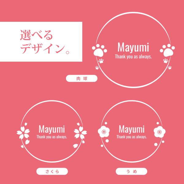 ・7種類のデザイン(肉球・桜・梅・ハイビスカス・バラ・カーネーション・クローバー)、2種類のフォント(ブロック体・筆記体)、8種類のメッセージからお好きなものを選択可能