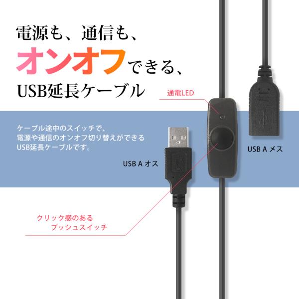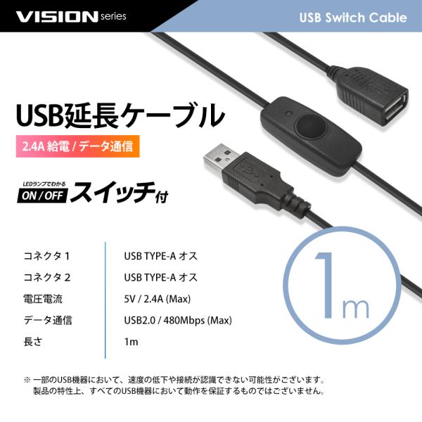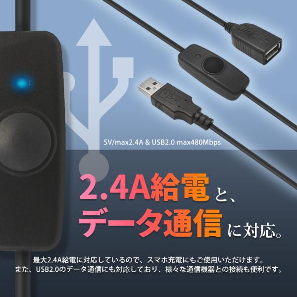 USBスイッチ付き 延長ケーブル 充電 給電 データ通信 2.4A USB2.0 LEDデスクランプ ライト 扇風機 温風機 USBメモリ スピーカー等 1m 711051