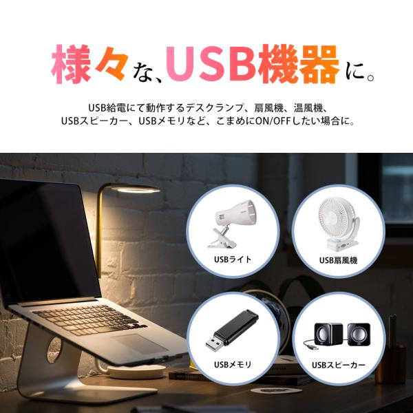 また、データ通信にも対応していますので、USBフラッシュメモリやmicroSD/SDカードリーダー、USBスピーカーなどのオンオフにもお使いいただけます。