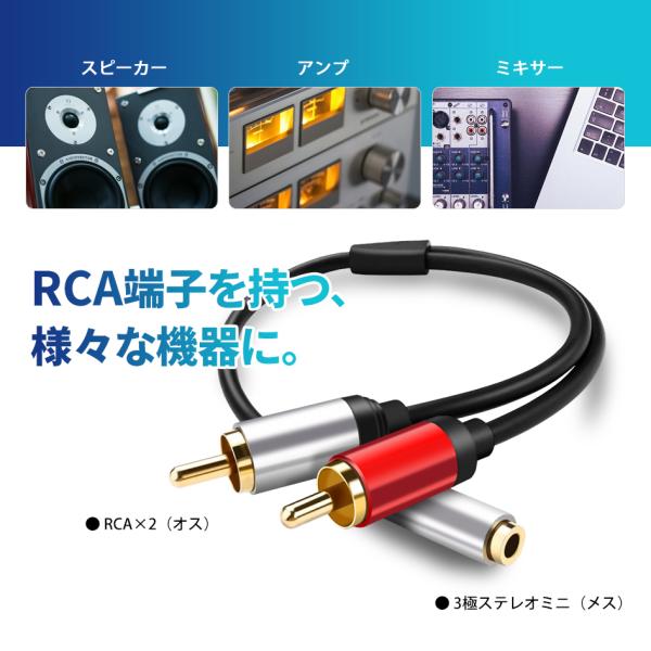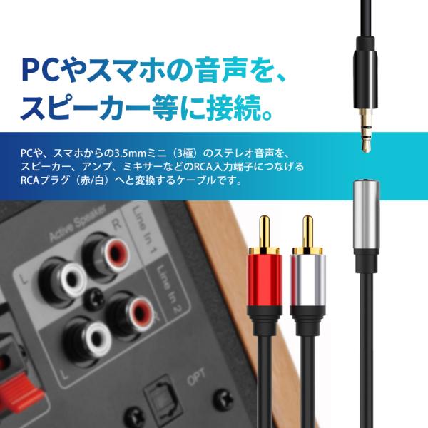 3.5mmステレオミニ端子(パソコン、スマートフォン、DVDプレイヤー、DAPなど)の機器をRCA端子(スピーカー、アンプ、ミキサー)などで使うことができます。