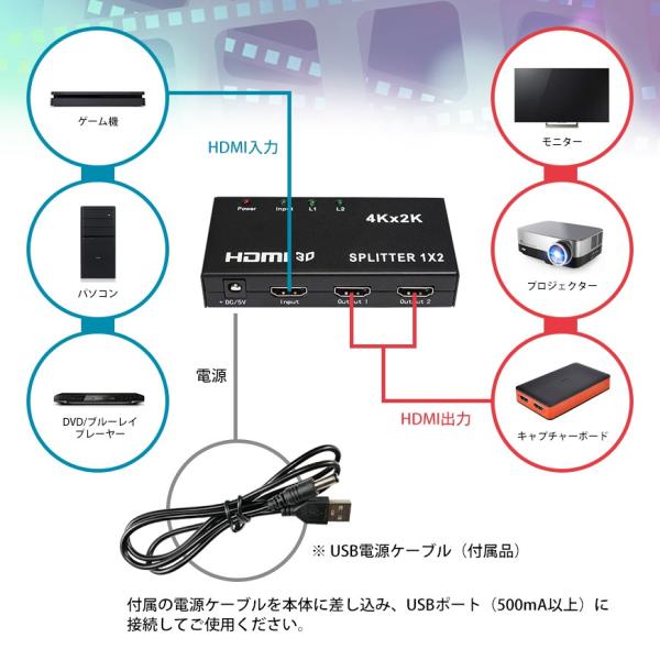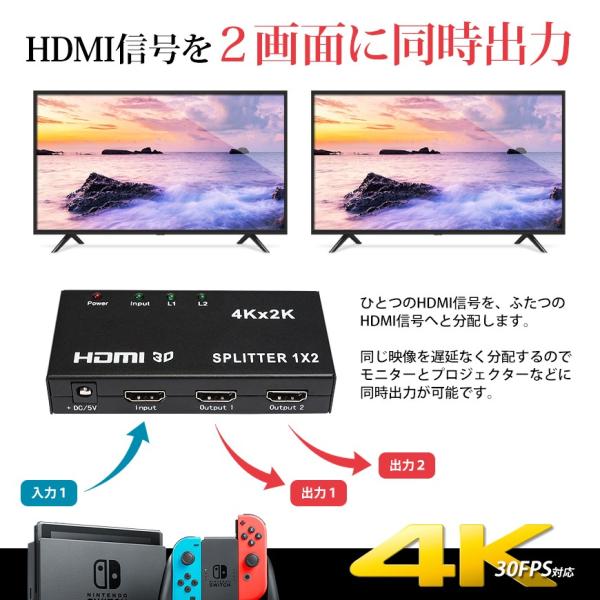 HDMI分配器 スプリッター 入力1端子 同時出力2端子 4K フルHD
