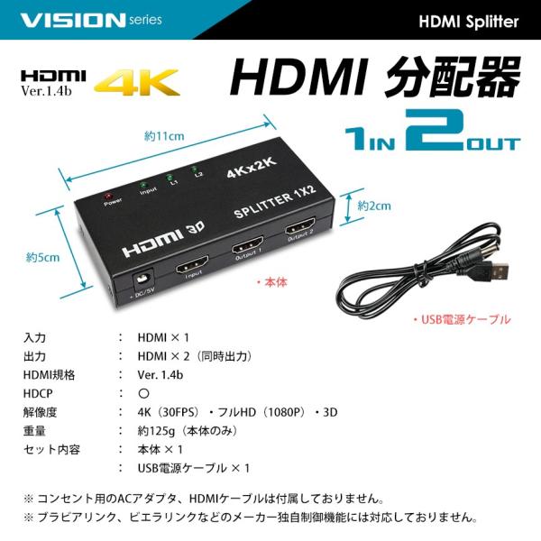 VISION HDMI 分配器 スプリッター 入力1端子 同時出力2端子 4K 3D映像対応 フルHD PS4 PS5 NITENDOスイッチ プロジェクターに