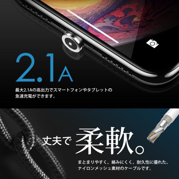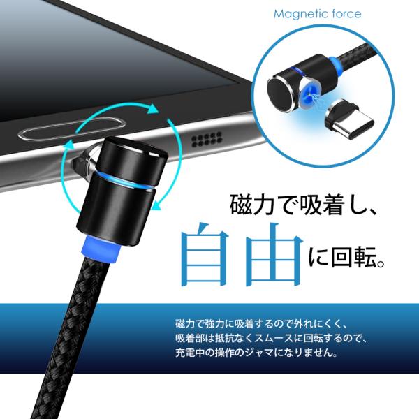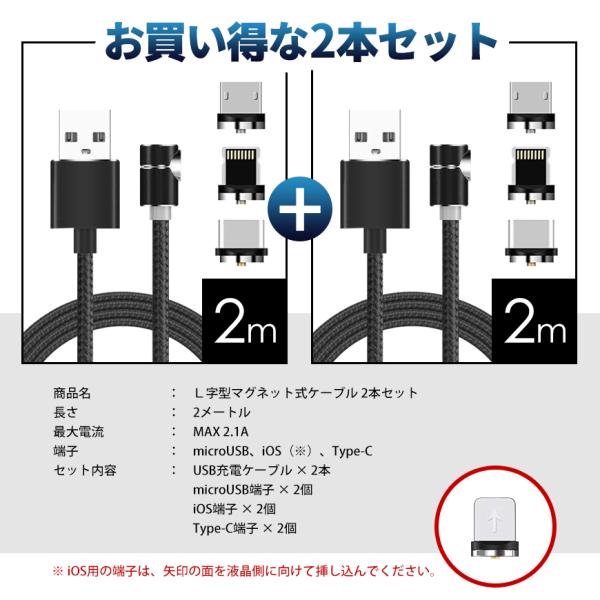 L字型 マグネット 充電 ケーブル TYPE-C Micro USB Android iPhone スマホ 充電 ナイロンメッシュ 黒 2m 2本セット