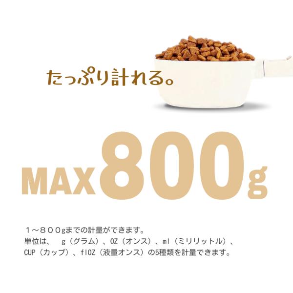・g(グラム)、ml(ミリリットル)、oz(オンス)、CUP(カップ)、flOZ(液量オンス)の単位に対応