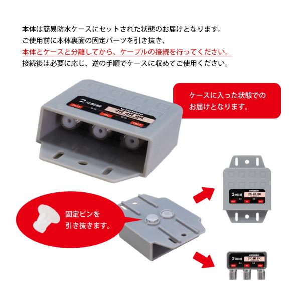 2分配器 同一方向 1年保証 簡易防水ケース付 4K 8K 対応 TV テレビ アンテナ 全端子電通型 3.2GHz F型 地デジ BS CS 衛星放送 分配 VISION