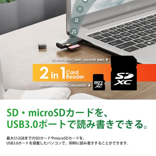 USB-Aポートを利用してSDカードやmicroSDカード読み書きできます。