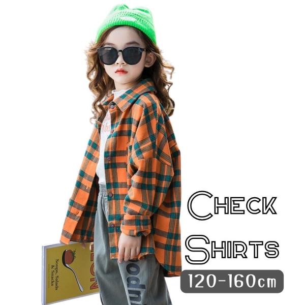 チェック柄 ボタンシャツ 襟付き オフショルダー ライトアウター オレンジ 春秋冬 長袖 女の子 ガールズ 韓国子供服 120cm 130cm 140cm 150cm 160cm