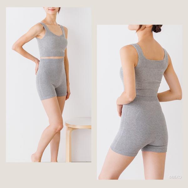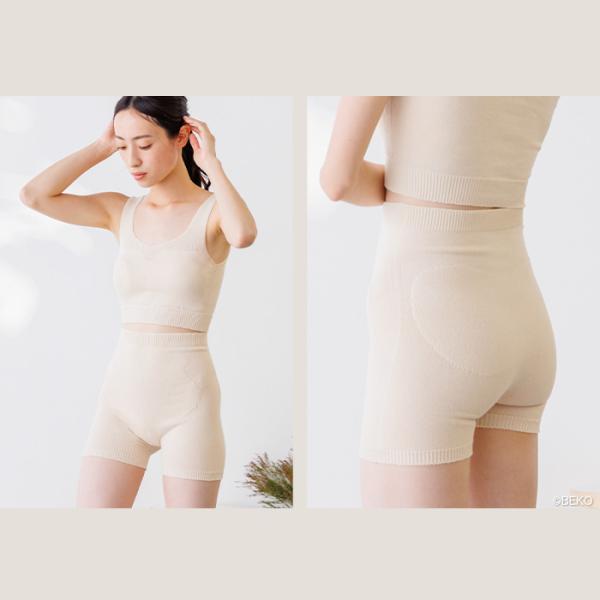 ウエストと足回りのゴムは一体型にすることで捲れ上がりを軽減しました。
