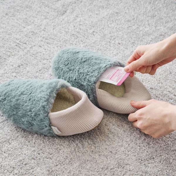 電子レンジで温めたジェルパックをポケットに入れて使用するスリッパです