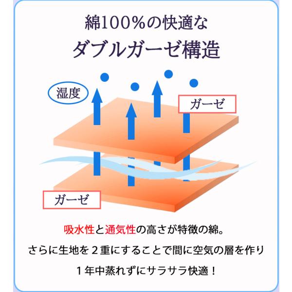 綿100%の快適なダブルガーゼ構造で、吸水性と通気性の高さが特長。シーズンを問わず1年中快適にご着用いただけます。