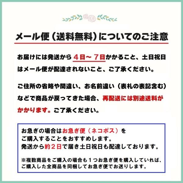 お届けには発送から4〜7日かかること、土日祝日はメール便(普通郵便)が配達されないことをご了承ください。