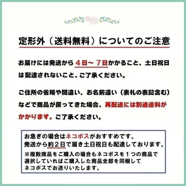 お届けには発送から4〜7日かかること、土日祝日はメール便(普通郵便)が配達されないことをご了承ください。