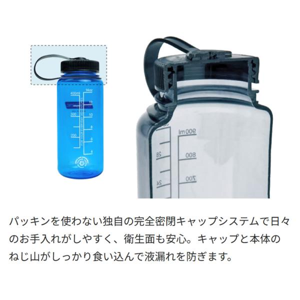 キャップと本体のねじ山がしっかり食い込んで液漏れを防ぎます。パッキンも不要なため衛生面も安心です。