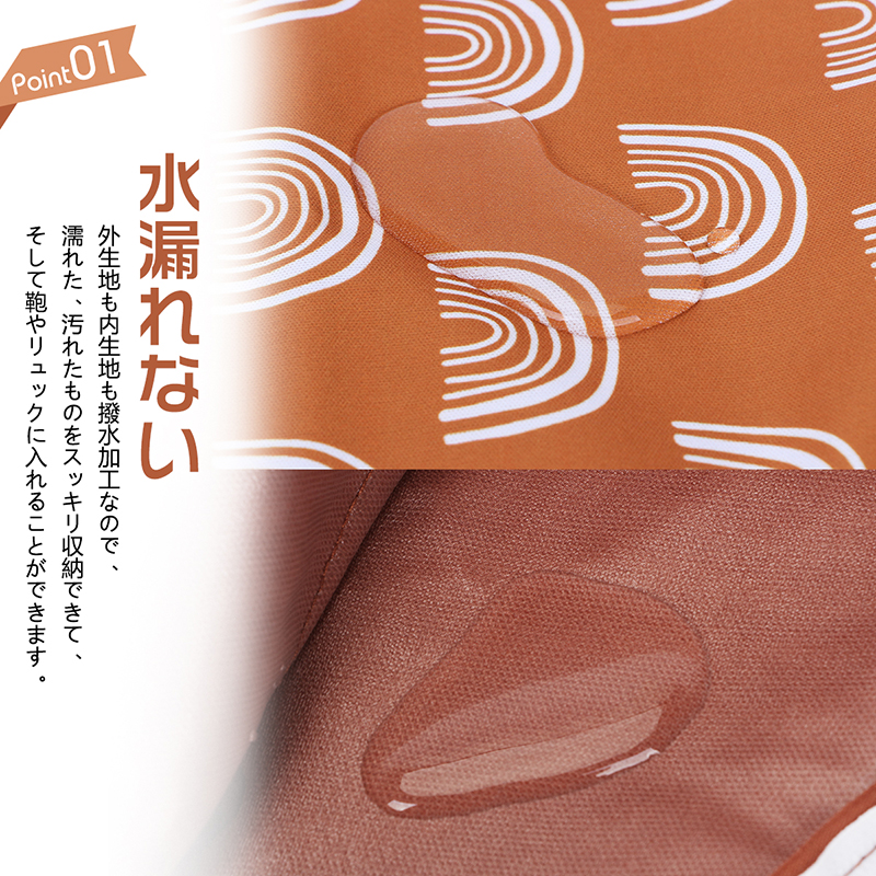 【水漏れない・撥水加工】外生地も内生地も撥水加工なので、濡れた、汚れたものをスッキリ収納できて、そして鞄やリュックに入れることができます。