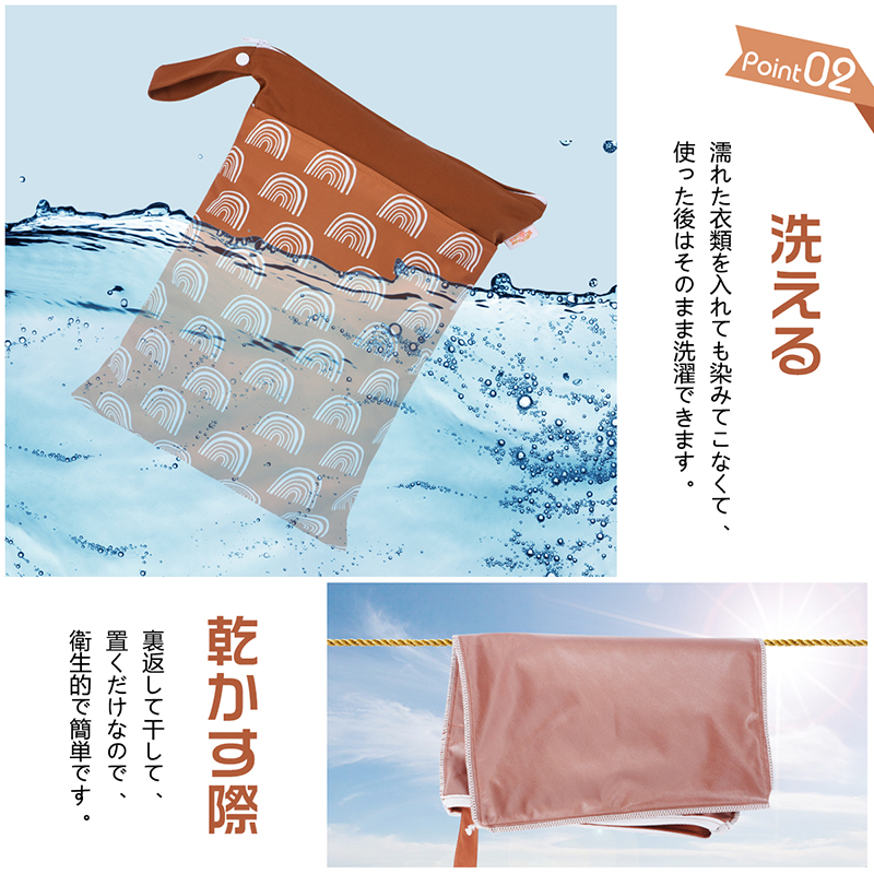 【洗える・衛生的】テ濡れた衣類を入れても染みてこなくて、使った後はそのまま洗濯できます。乾かす際は、裏返して干しておくだけなので、衛生的で簡単です。