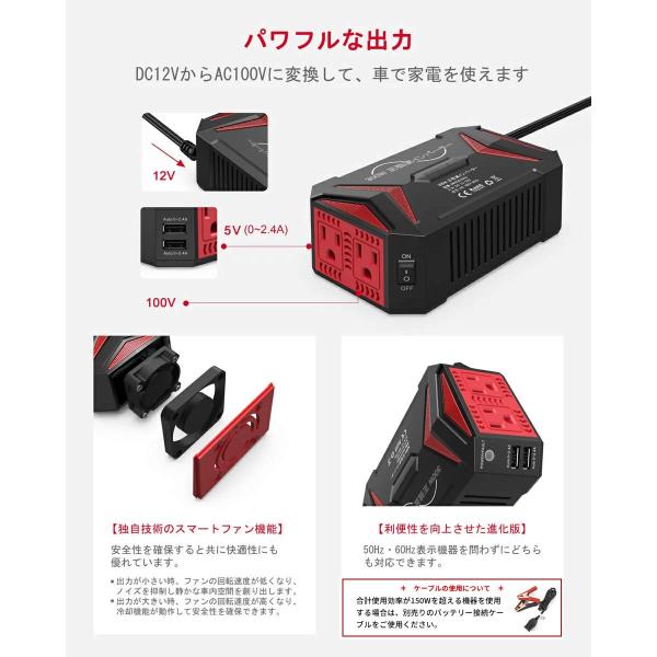 カーインバーター シガーソケット コンセント 150W: DC12VをAC100Vに変換 USB2ポート搭載 車載用インバーター 12V車専用 BT6500-BK BESTEK