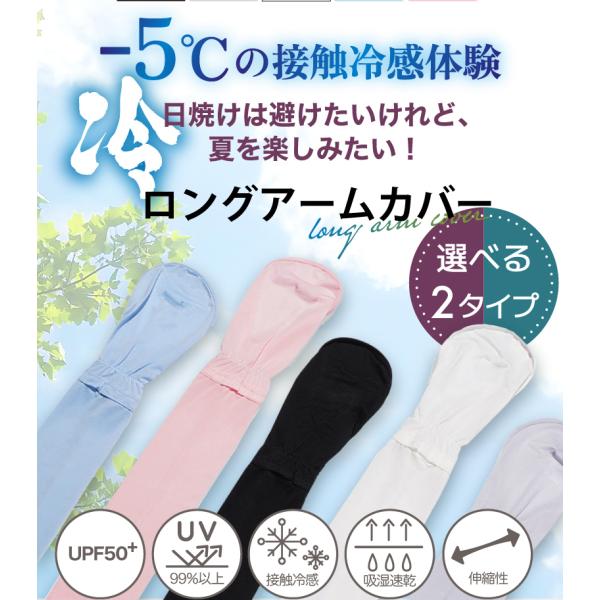 ●触れるとヒヤッと涼しく、さらにUVカット効果もあるロング丈アームカバー。