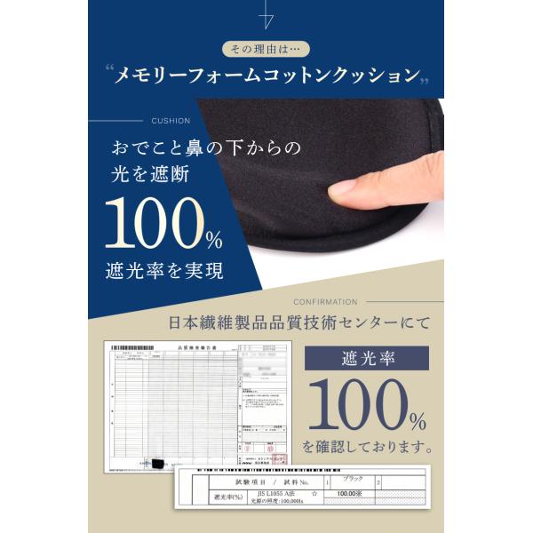 ●メモリーフォームコットンクッションを採用することで、おでこと鼻の下からの光を遮断し100%の遮光率を実現しました。