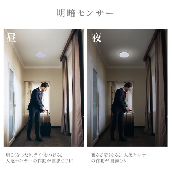 【人感・明暗センサー付き】必要な時だけ明るく点灯し、ムダな消費電力を省いて節電します。明るくなったり、ライトをつけると人感センサーの作動が自動OFF!夜など暗くなると、人感センサーの作動が自動ON!