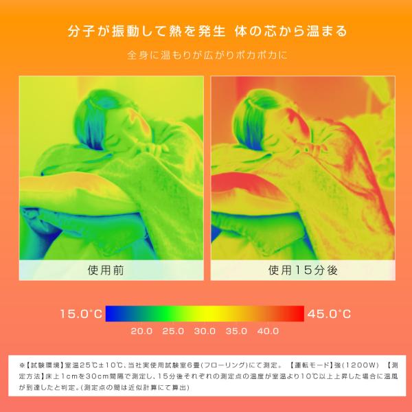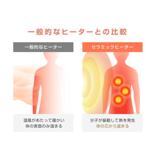 【遠赤外線】遠赤外線を照射すると分子レベルで体を振動させて熱が発生。全身にぬくもりが広がります。風を出さないので空気が乾燥しにくく、燃料を使わないため空気が汚れず環境にやさしい。