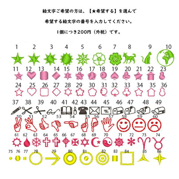 ※絵文字と刺繍糸のカラー変更は、1個につき200円(外税)です。ご注文後に当方にて料金訂正させていただきます。