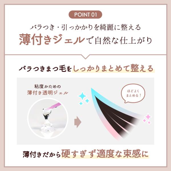 薄付きのジェルが自まつげを優しく包み込み、理想のカールとコーティングを24時間キープ。美容液成分配合で、日中のダメージから大切なまつ毛を守ります。
