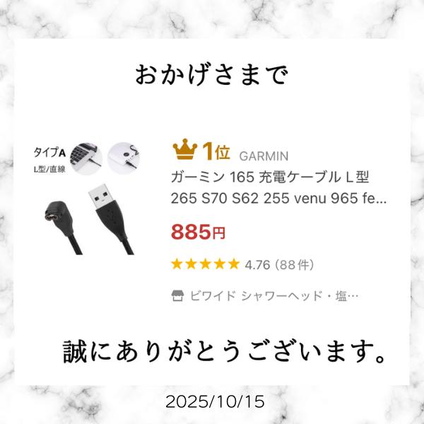 ガーミン 165 充電ケーブル L型 S70 S62 S50 S44 265 fenix