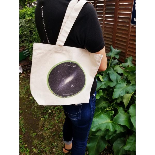 ●厚手で丈夫な12オンス・コットンキャンバス生地を使ったトートバッグに、アンドロメダ座大銀河M31の写真をフルカラーで描いてあります。