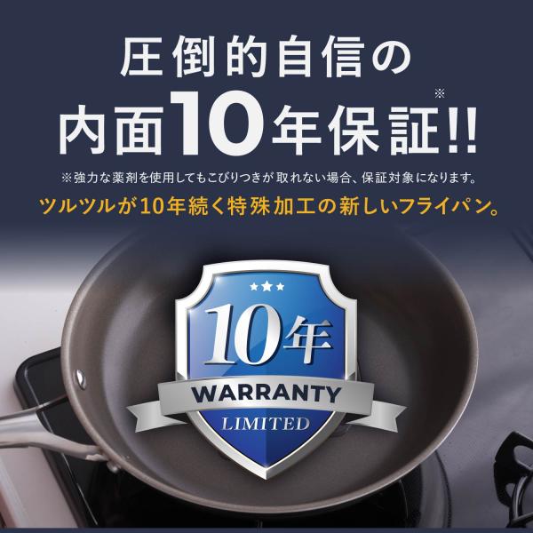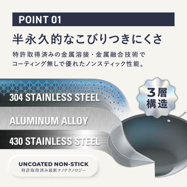 コレール、ずっとあなたの食卓に 生涯よりそうフライパン。こびり付くと、すぐ捨ててしまう、そんなフライパンの概念を変えていきます。半永久的なこびりつきにくさ:特許取得済みのドュラナノテクノロジーにて表面にコーティングをせず、8000℃の温度のレーザーで金属の粉末を溶接することにより、ノンスティック性が高く、剥がれない、削れない表面を実現。素材のうまみをギュッと凝縮:強火での調理やオーブンでの調理も可能です。ステンレス鋼の蓄熱性を活かし強火調理ができるので、プロの料理人のような味わいがご家庭で楽しめます。金属製のキッチンツール使用可能:デュラナノテクノロジーにより金属自体が加工されているため、コーティングがはがれる心配がありません。そのため、金属ヘラなどの金属製のキッチンツールを問題なく使用することができます。高い耐久性と耐摩擦性:独自のテクノロジーによる表面の為、従来のコーティングフライパンでNGといわれていたことができます。調理後の熱い状態に水を注ぐことで汚れ浮かしも簡単にでき、洗浄できます。また、表面の耐久性が高いため、金たわしでの洗浄も可能です。