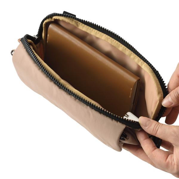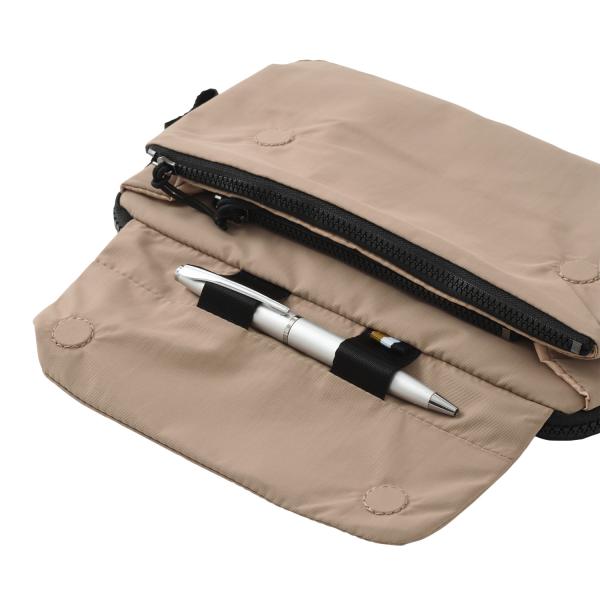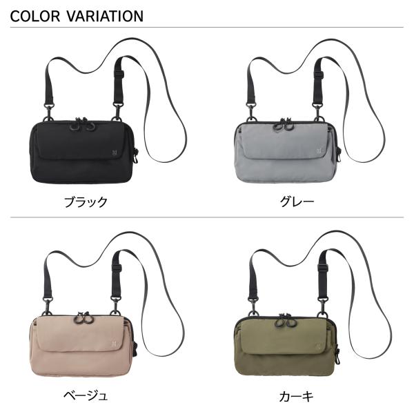 収納力・軽さ・耐水性に優れたミニマルデザインの小型ショルダーバッグ。フロントのマグネット式フラップを開けた内装部分には、カードや小銭の仕分けに便利なポケットや仕切り、ペンホルダーを搭載。メイン収納であるファスナーポケットは文庫本も入るサイズ感。ミニマルなデザインとは裏腹に使い勝手を考え抜かれたポケットの配置が魅力です。ショルダーストラップは取り外しできるので、ストラップなしでポーチとしても利用できます。