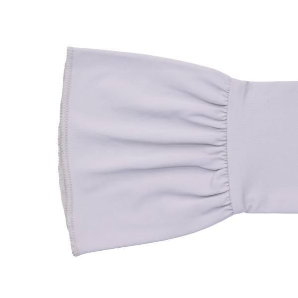 大きめフリルが手元をしっかりカバーするフリルアームカバー。UVカット率99.9になっています。接触冷感素材なので、ひんやり気持ち良くなっていて、暑い夏を少しでも快適に過ごすことができます。手の甲までしっかり日よけでき、手を握ると指先が隠れるサイズ感になっています。