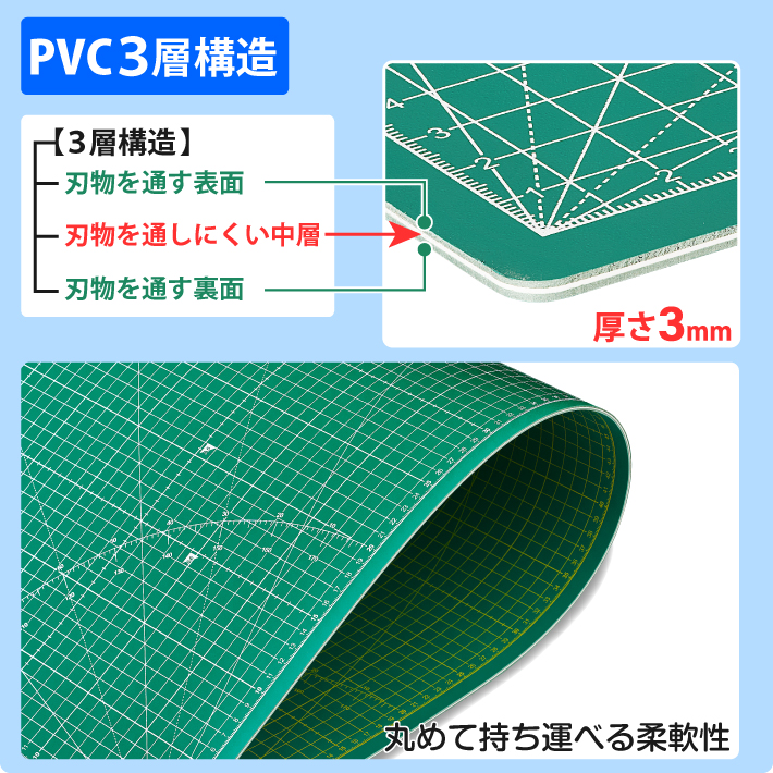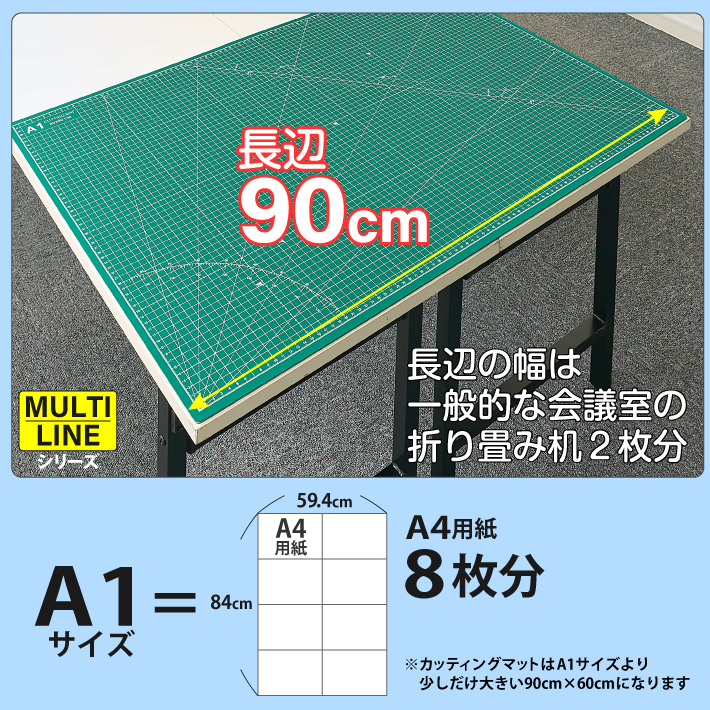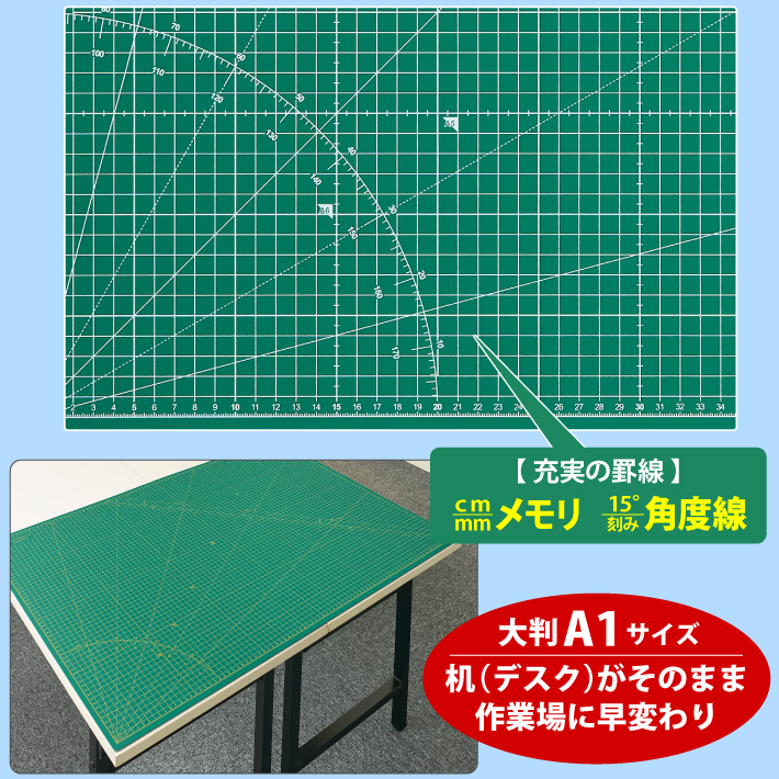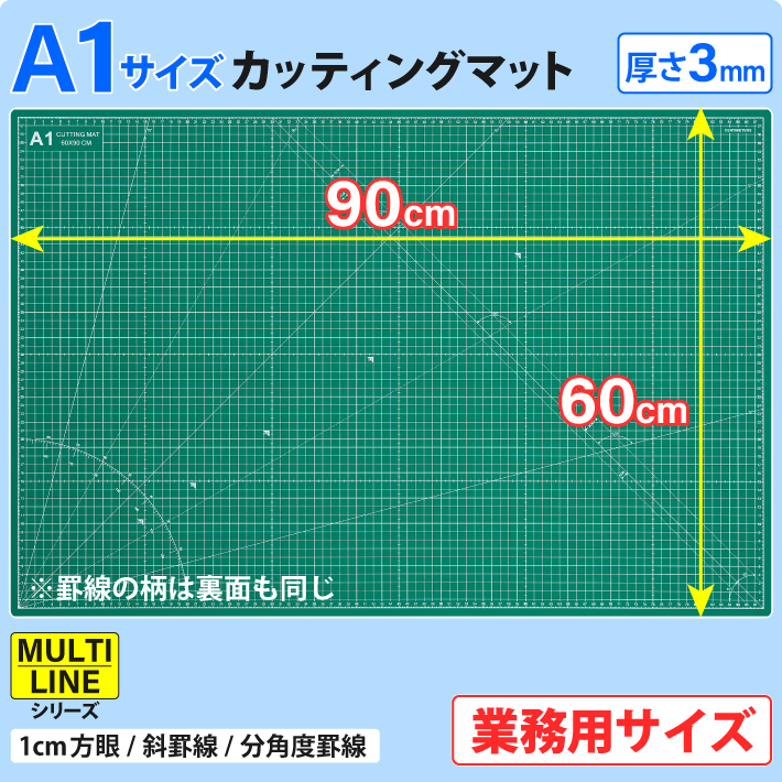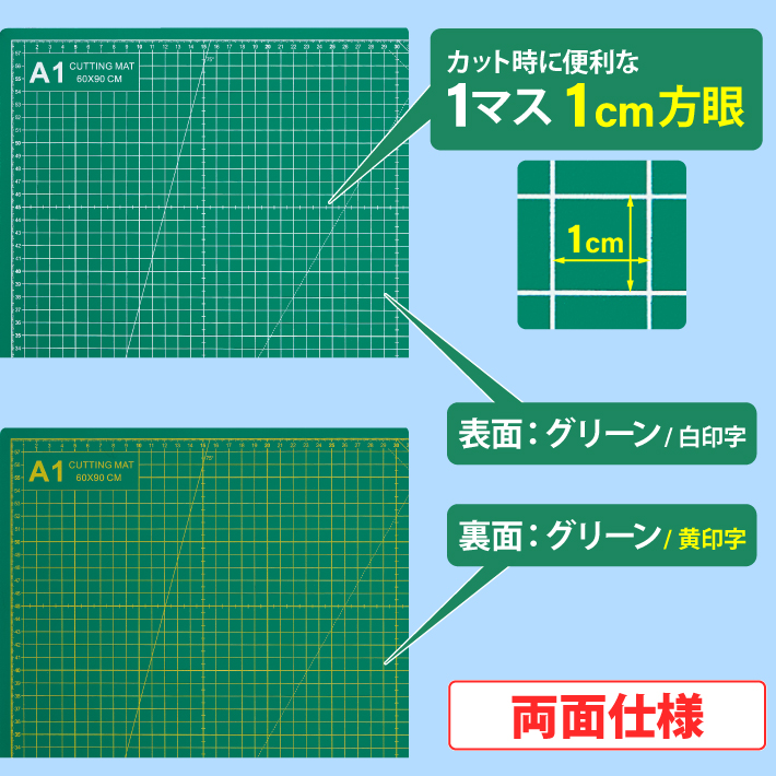 カッティングマット A1 サイズ 60cm x 90cm x 3mm 1cm方眼 特大 両面メモリ 業務用 工作 カッターマット大判 デスクマット 緑 グリーン 両面目盛り 切り出し