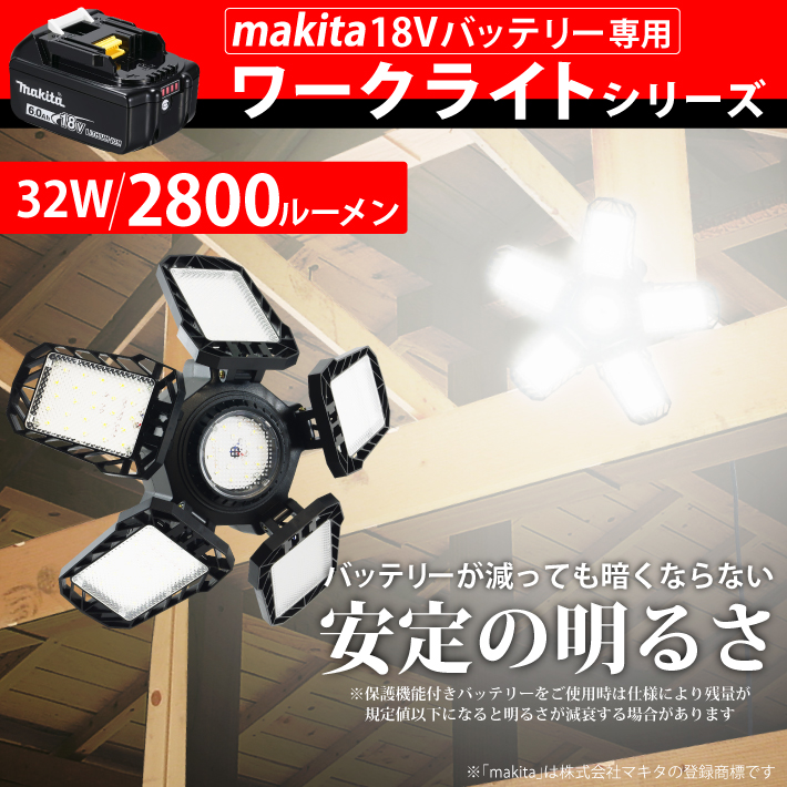 【1年保証】HEMAJUN 投光器 予備用ライト1個付 led 折りたたみ投光器 マキタ バッテリー 18V と互換性あり 32W 2800lm 18V専用 6500K 作業灯 ライト 充電式