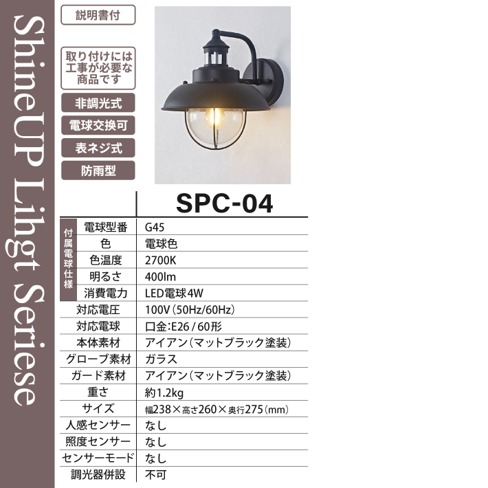 玄関灯 ポーチライト 防雨 外灯 玄関 LED 照明 門柱灯 庭用 壁掛けライト ブラケットライト おしゃれ PSEマーク取得 SPC-04