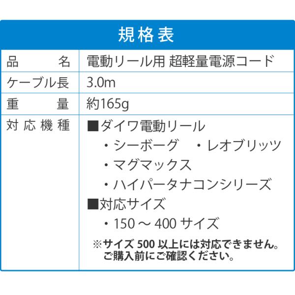 電動リール用電源コード 長さ 300cm スーパーエアー 超軽量 約165g ダイワ電動リールと互換性あり シーボーグ レオブリッツ マグマックス