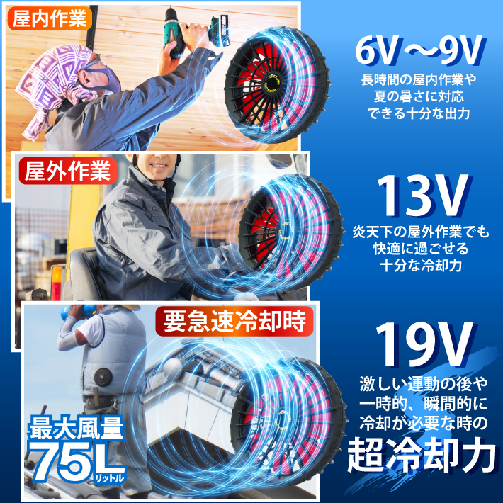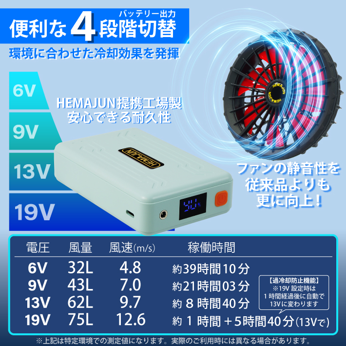 ・19V対応、最大風量75L/秒で約1時間+5時間40分(13Vで)連続使用可能です。(1時間経過後、自動で13Vに変わります)
