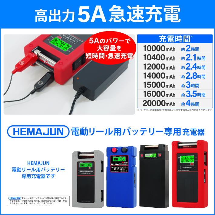 【短絡防止機能搭載】公式 HEMAJUN (ヘマジュン) 電動リール用バッテリー専用 5A 急速充電器 ワニ口仕様 HEMAJUN 電動リール バッテリー対応 ショート防止