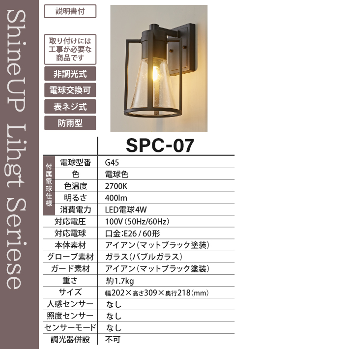 玄関灯 ポーチライト 防雨 外灯 玄関 LED 照明 門柱灯 庭用 壁掛けライト ブラケットライト おしゃれ PSEマーク取得 SPC-07