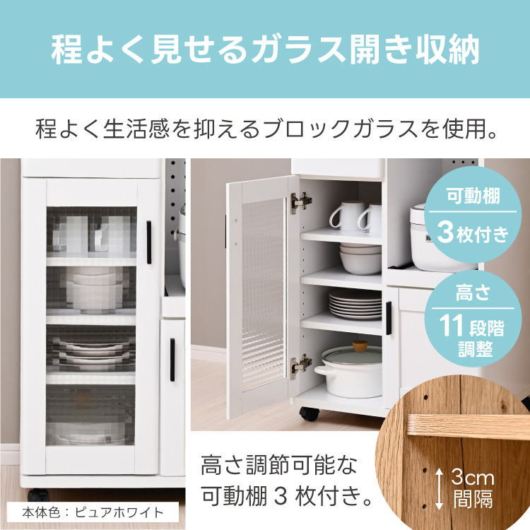 コンパクト キッチンカウンター レンジ台 幅60cm ロータイプ 間仕切り キャスター付き 収納 炊飯器ラック スリム 木製 北欧 ガラス扉 一人暮らし