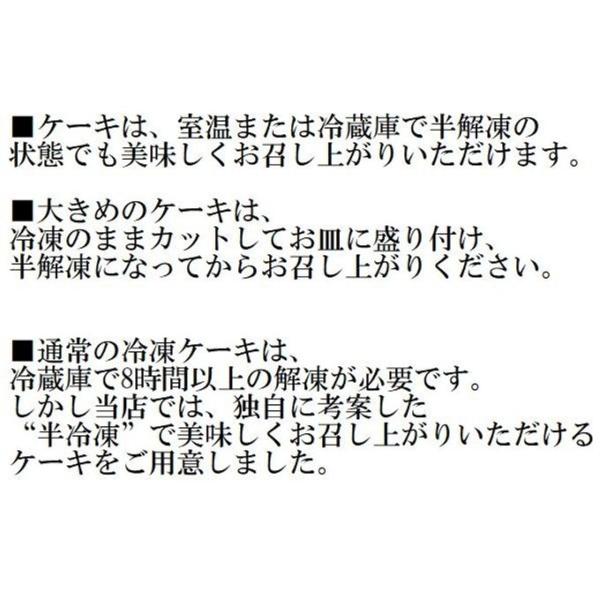 ■通常の冷凍ケーキは、冷蔵庫で8時間以上の解凍が必要です。 しかし当店では、独自に考案した“半冷凍”で美味しくお召し上がりいただけるケーキをご用意しました。