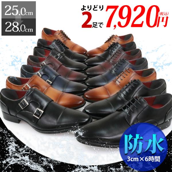 ビジネスシューズ 防水 メンズ 2足セット 3E 革靴 ストレートチップ スリッポン 紐なし ローファー ダブルモンク 紳士靴 営業 通勤