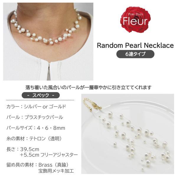 強度のある透明なテトロン糸にサイズの違うパールを6連でランダムにあしらったネックレス。