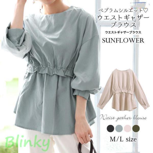 ウエストギャザー フリル ブラウス レディース トップス 長袖 無地 ブラウス ぺプラム シャツ ギャザー パーティ 春 秋 体型カバー オフィス 通勤