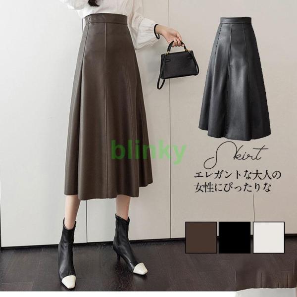 レザースカート プリーツ Aライン レディース ハイウエスト ロング丈 レザー 可愛い 体型カバー フェイクレザー 革スカート エレガント