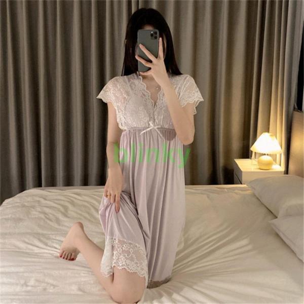 ネグリジェ パジャマ レディース 夏 半袖 ワンピース ルームウエア パッド付き ゆったり 女性 部屋着 寝巻き レース 姫系 可愛い 柔らかい